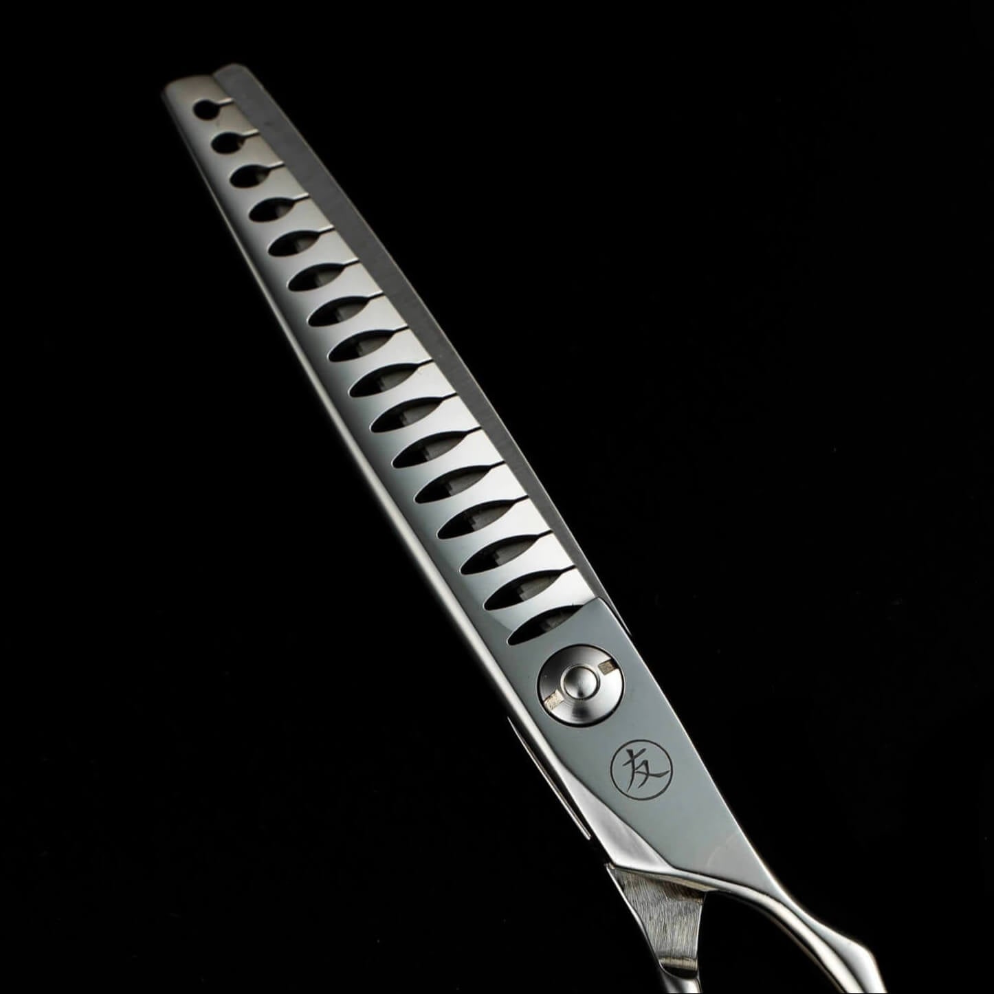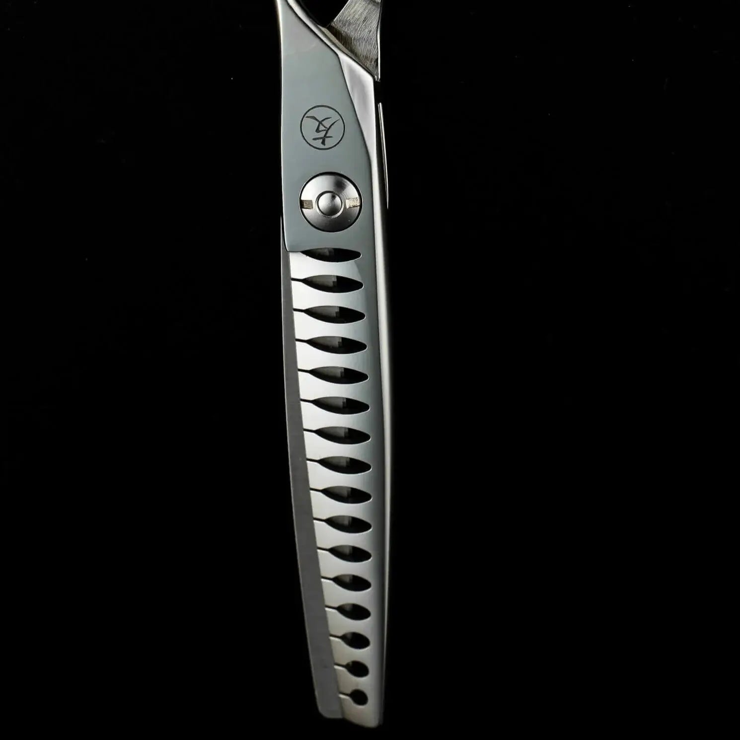 The SHATTER is a specialist texturising scissor with 16 wide teeth, removing up to 80% of hair in a single cut. Designed for creative hairdressing techniques, it excels at producing fragmented edges in longer hair or adding bold texture to short, cropped styles.