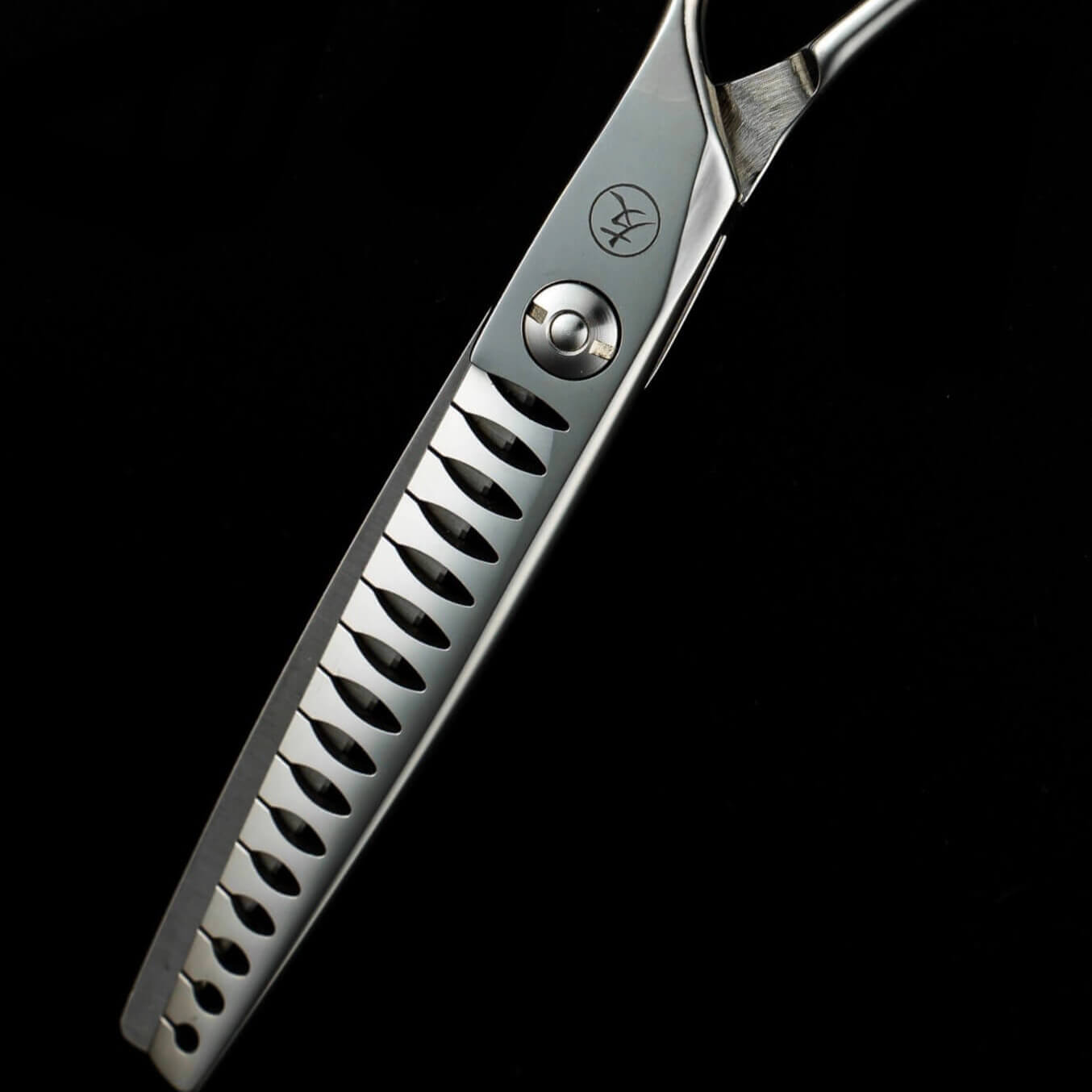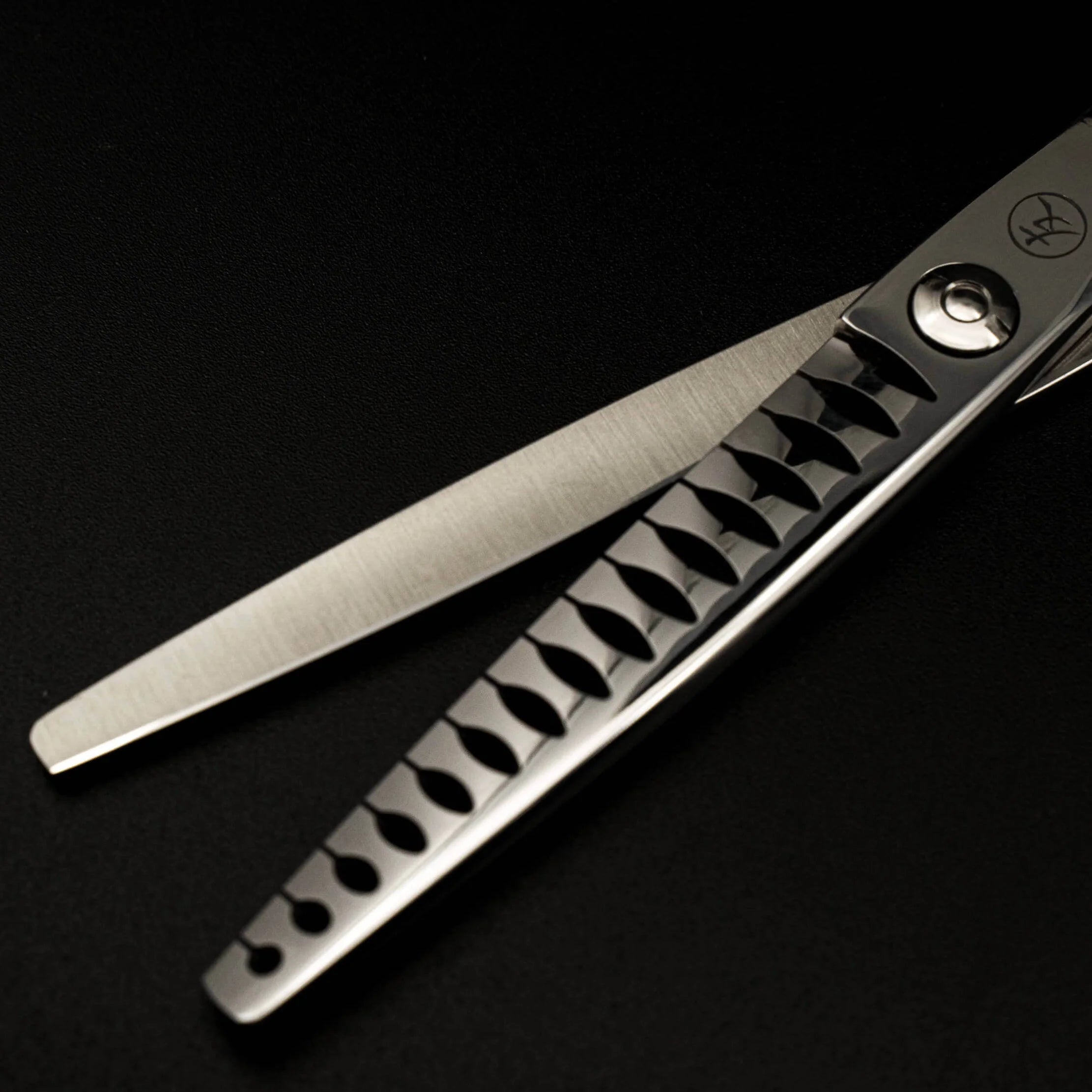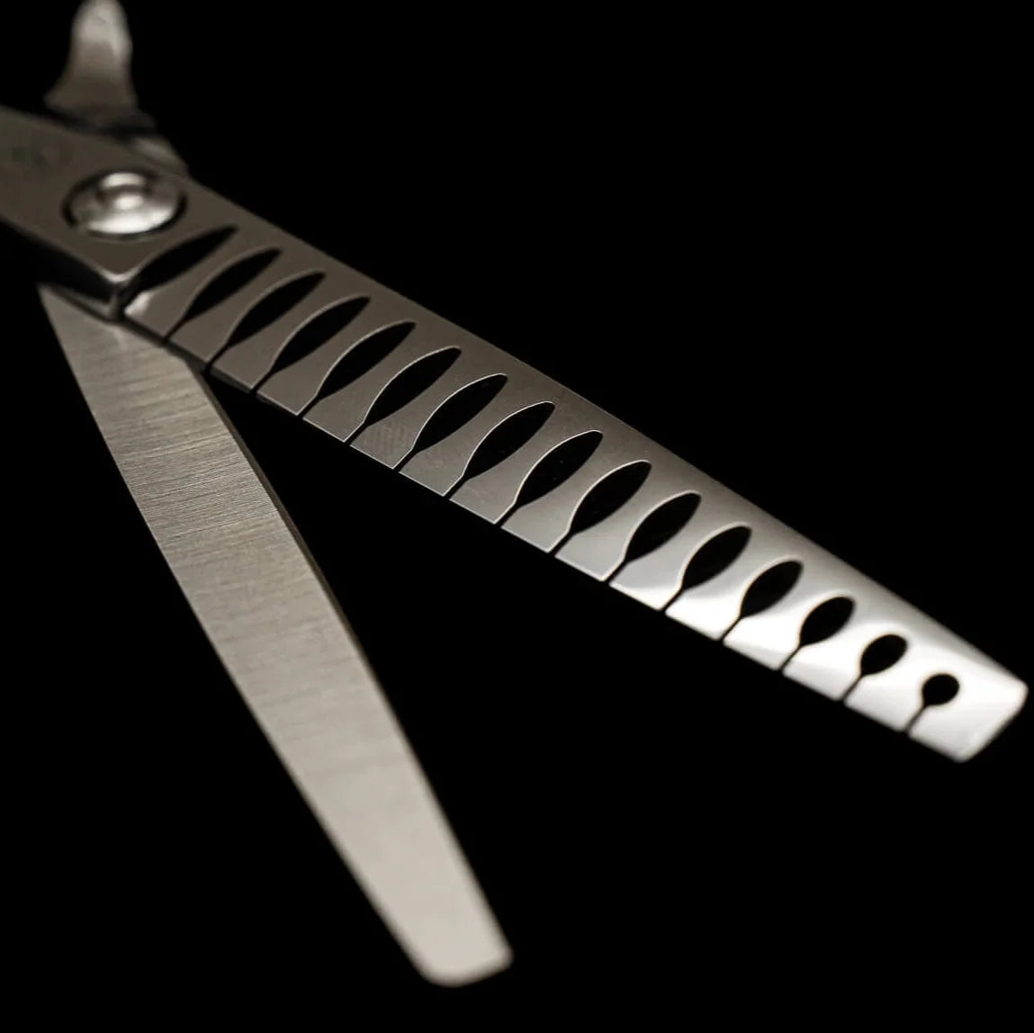 The AK SHATTER Texturising Scissors are a hybrid chunker–texturiser built for bold, creative styling. Designed for hairdressers and barbers who want to add shattered texture and movement with speed and control.